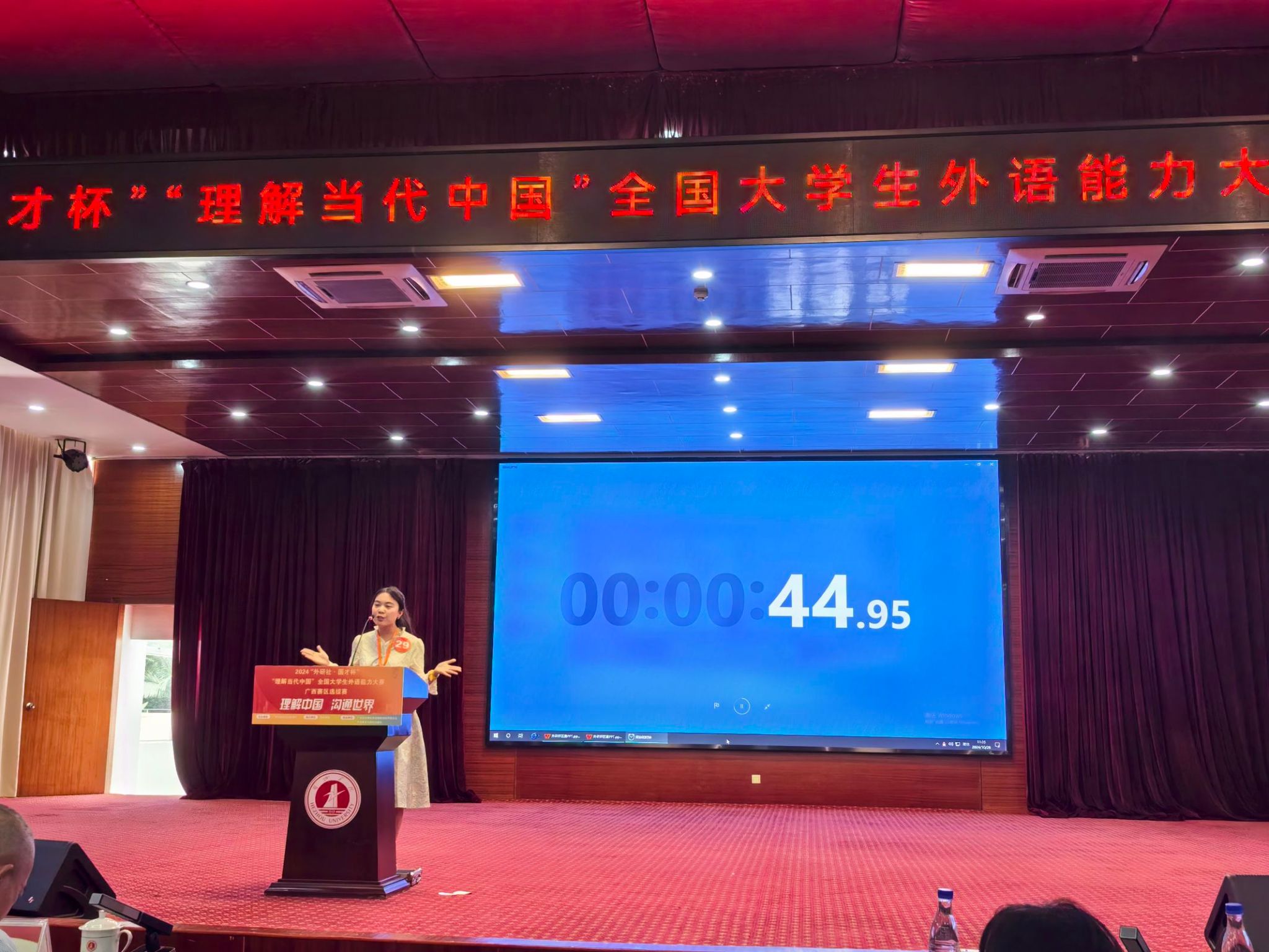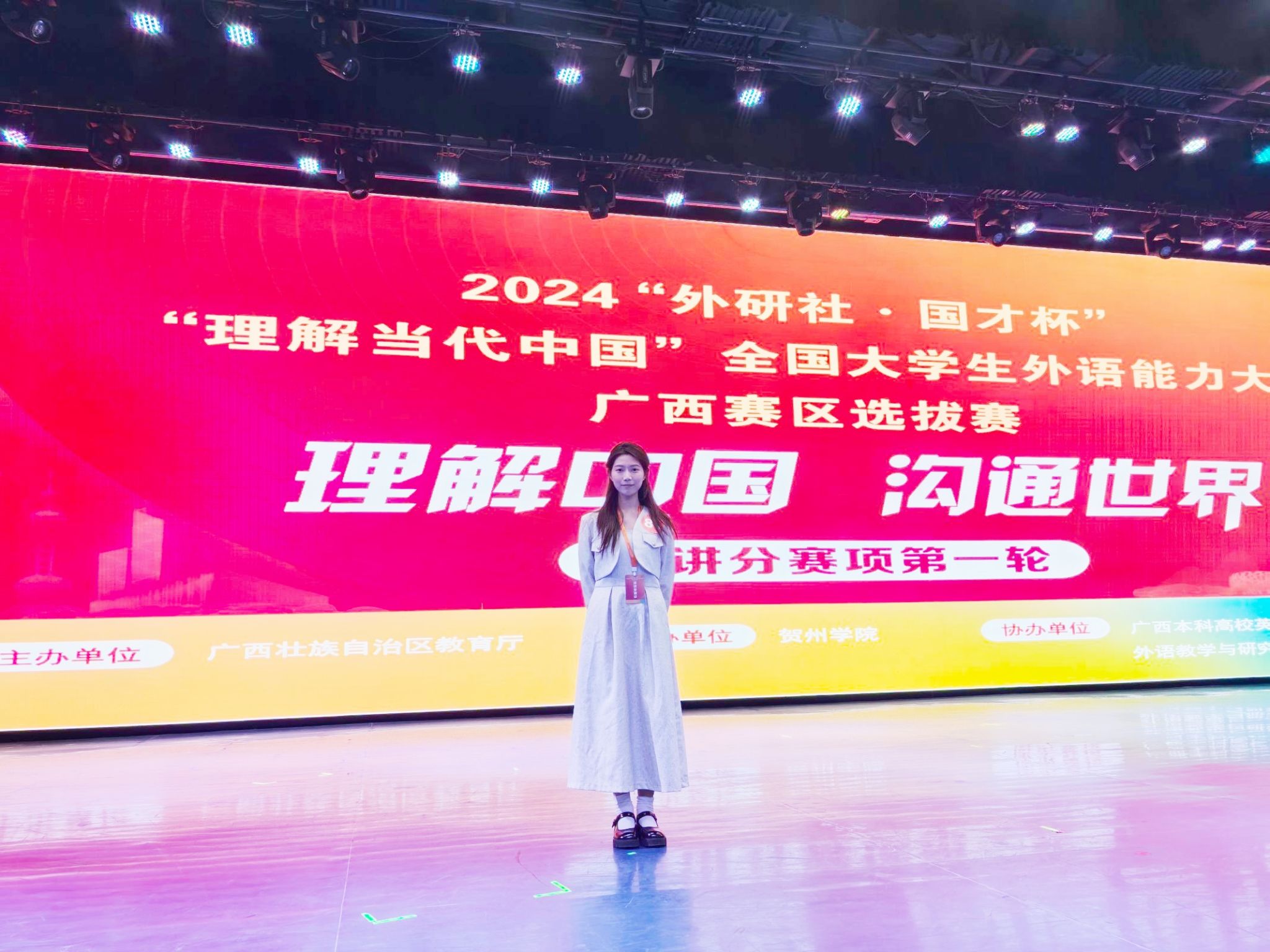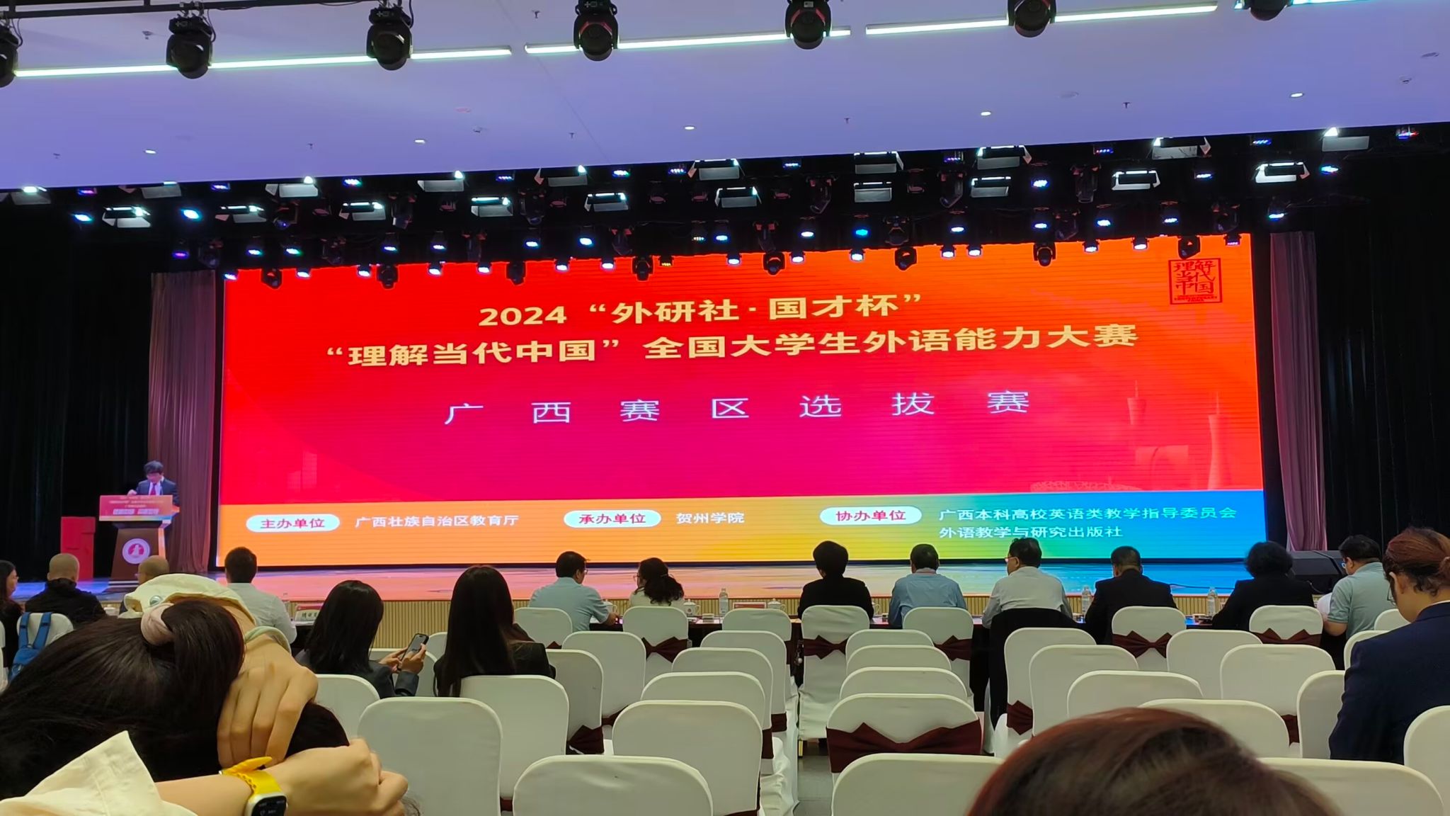 在秋高气爽的十月,为贯彻党的二十届三中全会精神,深化“三进”工作、创新课程思政,推进教育改革、检验教学成果,讲好中国故事、服务国际传播,在广西教育厅的指导下,由广西本科高校英语类教学指导委员会主办,外语教学与研究出版社协办的2024年“外研社·国才杯”“理解当代中国”全国大学生外语能力大赛广西赛区选拔赛的英语组演讲和口译竞赛于10月25日至27日在贺州学院西校区举行。