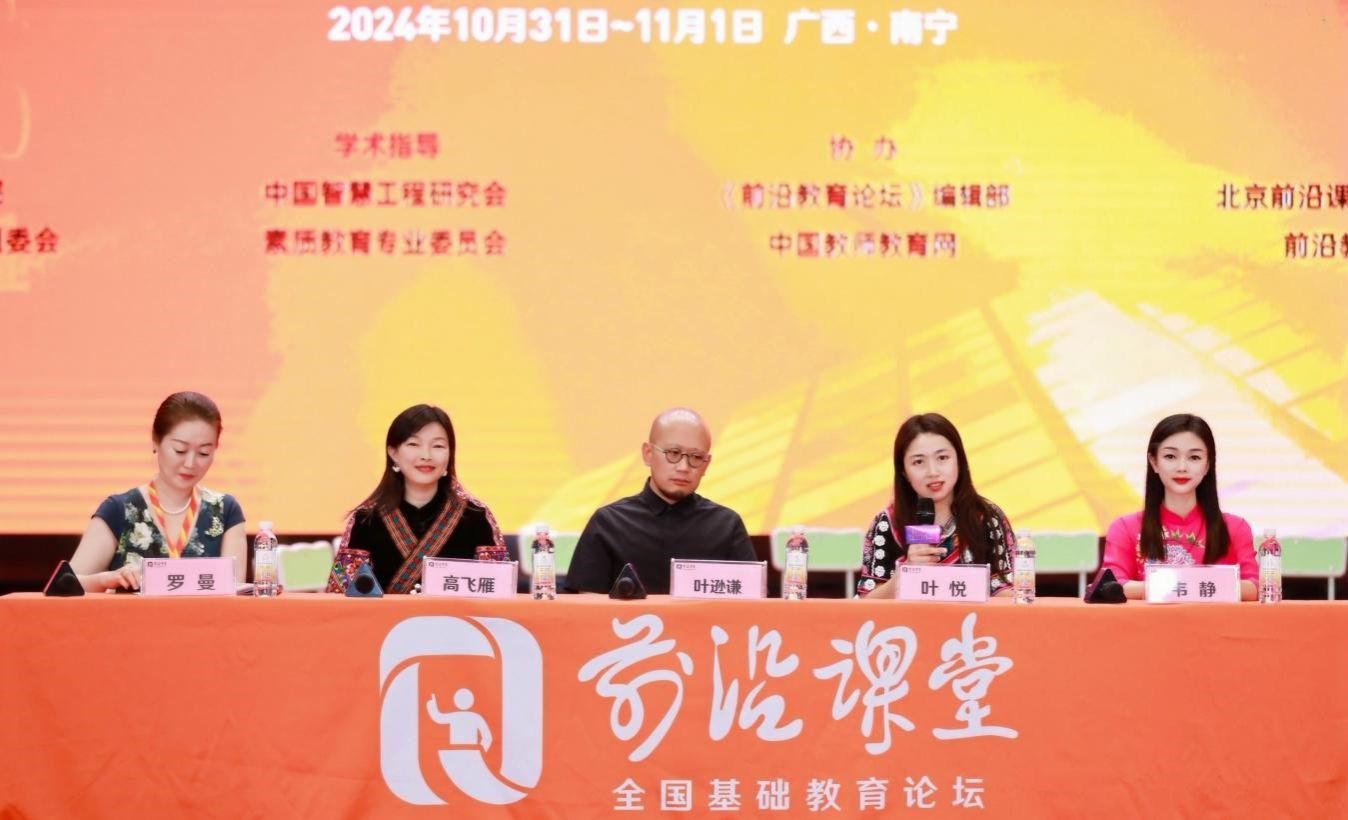 教育戏剧团队高飞雁、叶悦、基地学校南宁市华衡小学科研主任韦静老师以及喜马拉雅教育戏剧研究院院长、中国戏剧文学学会戏剧教育专业委员会主任委员、导演、戏剧教育专家叶逊谦老师共同参与了“前沿课堂”基础教育论坛主席、前沿教育科学研究院院长罗曼主持问课评课、专题指导活动,解答现场观众提出的问题。