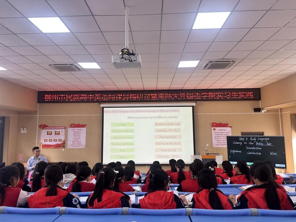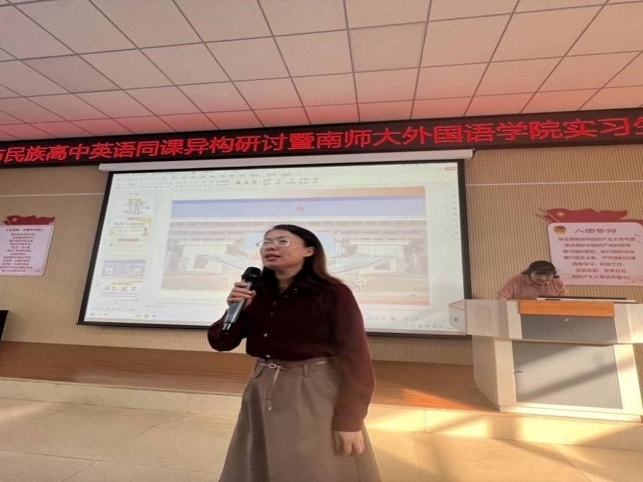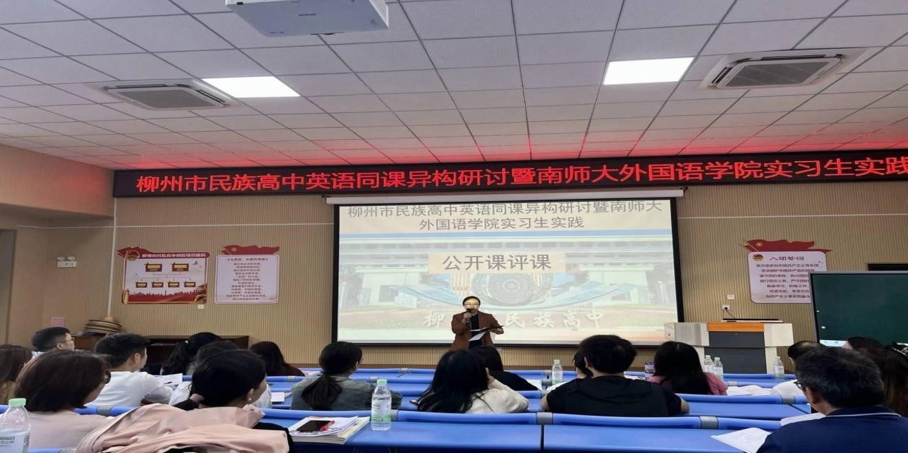 2020级英语专业实习生、带队老师刘婷婷和柳州市民族高中英语课程教研组教师们在柳州民族高中合班教室共同开展了“英语同课异构研讨暨南宁师大 ai去衣