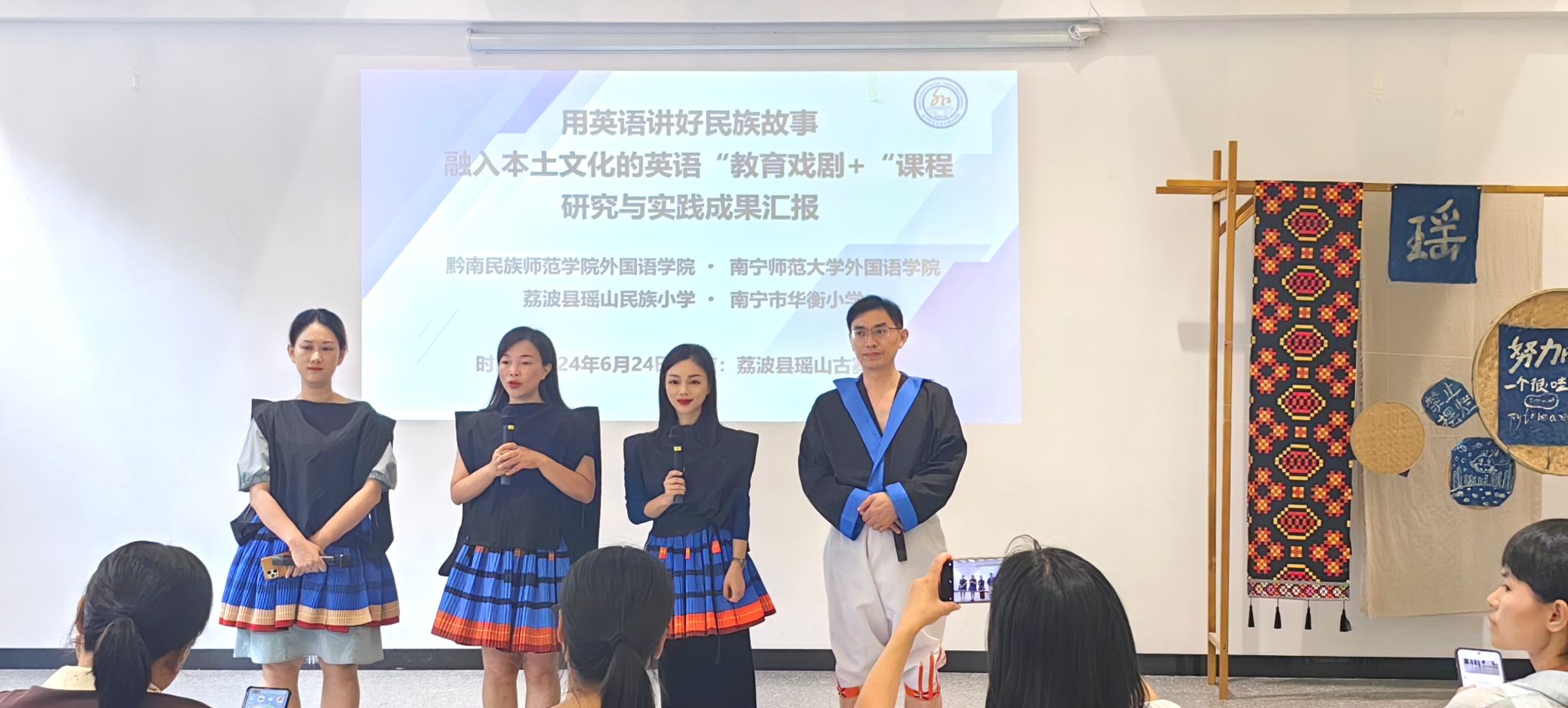 为了践行国家新时代育人理念,推动英语学科核心素养理念下的教学改革与创新,推动中华优秀传统文化创造性转化和创新性发展,宣传瑶山文化,铸牢中华民族共同体意识,宁师范大学外国语学黔南民族师范学院 ai去衣 协同实践基地学校南宁市华衡小学 2024 6 24日赴荔波县瑶山古寨开展用英语教育戏剧讲好瑶山故事”联合教研活动。本次联合教研活动由荔波县瑶山民族小学韦文丹校长主持,荔波县约150名师生代表参与了本次活动。
