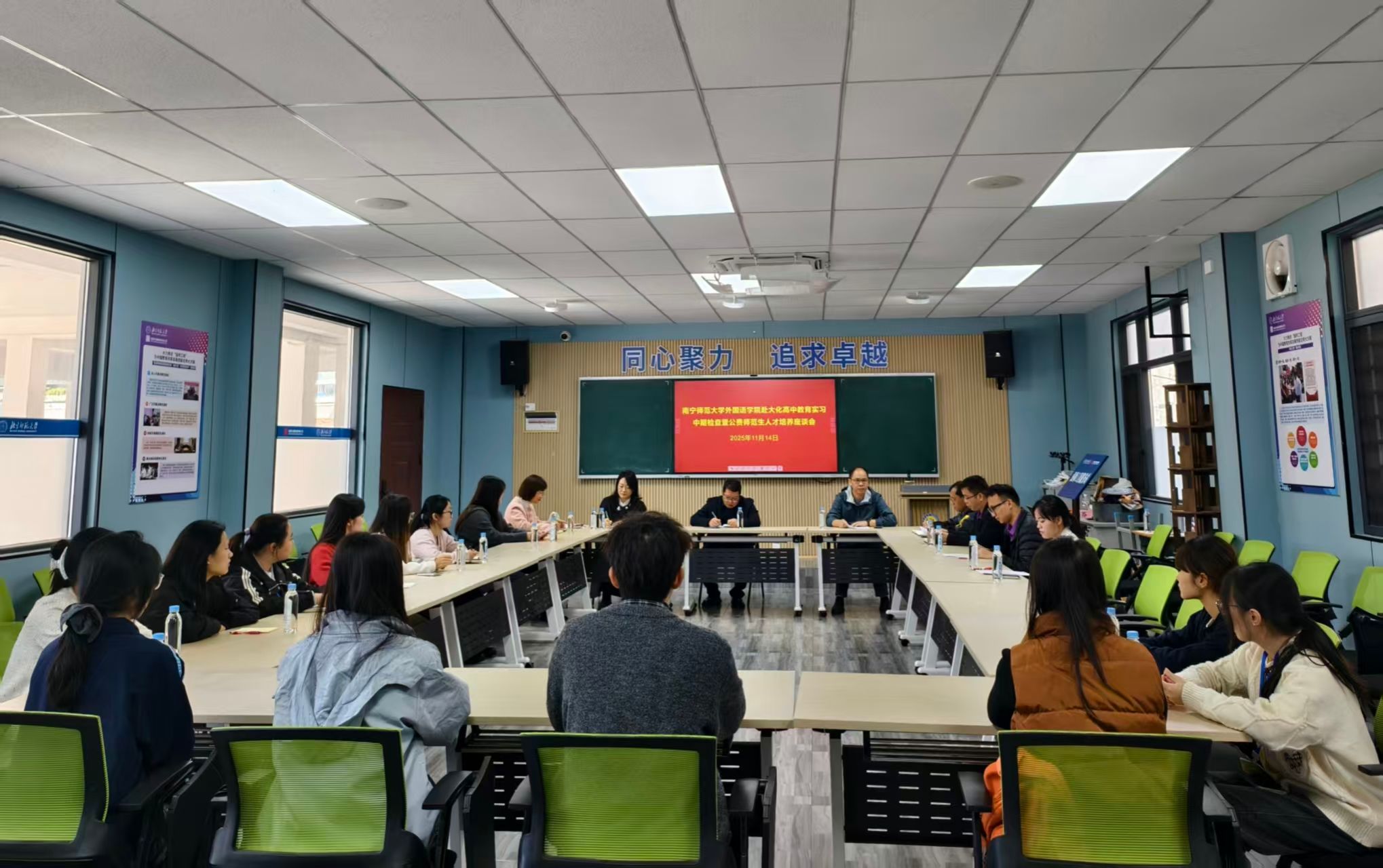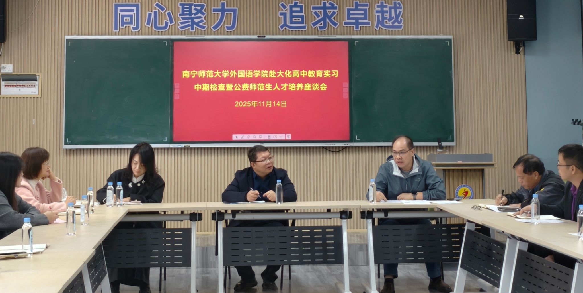 2022级英语专业公费师范实习生共同参会,会议由大化高中韦标东老师主持。