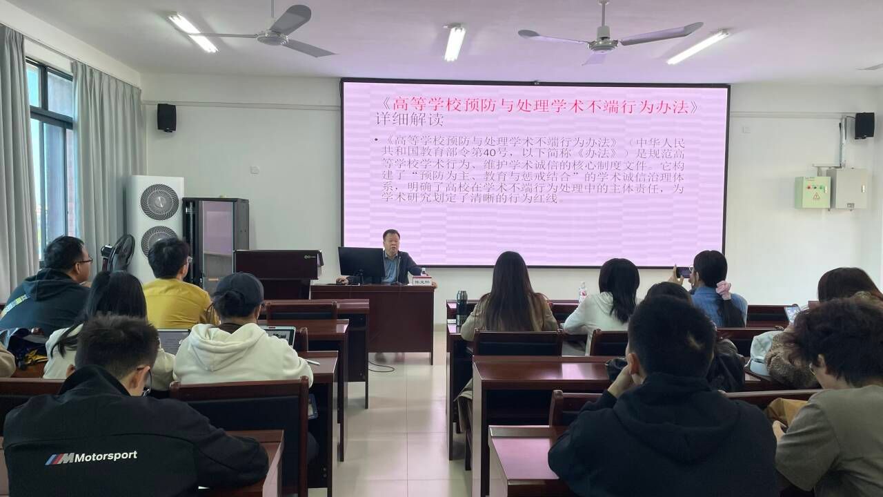 讲座伊始,陈光伟院长点明活动目的:为外语学科研究者敲响学术诚信警钟,助力构建风清气正的学术生态。随后,他带领新生解读《高等学校预防与处理学术不端行为办法》,强调“学术诚信是学术研究的灵魂”,明确七类学术不端行为及对应处理措施,着重说明学术不端将导致缓授、不授、撤销学位等严重后果。