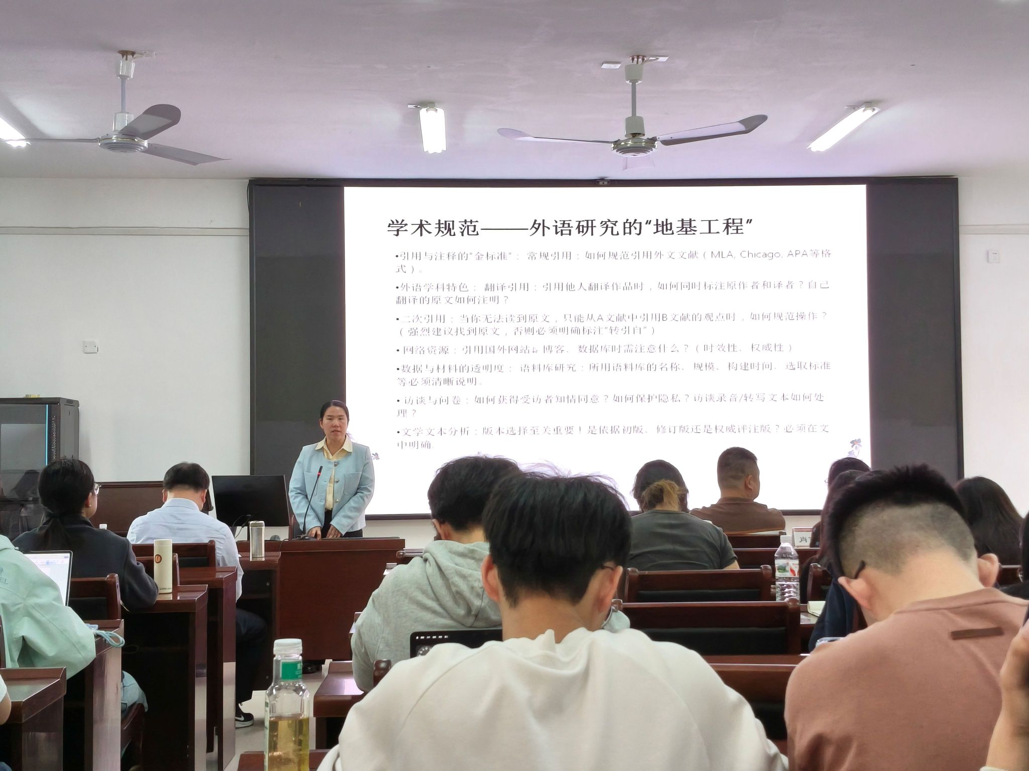 开展面向2023级、2024级研究生的“学术伦理与廉洁,构建外语研究的诚信基石”专题讲座。本次讲座特邀蒙岚教授担任主讲人,旨在深化学术研究者对学术规范的理解,筑牢外语学科研究的诚信根基。