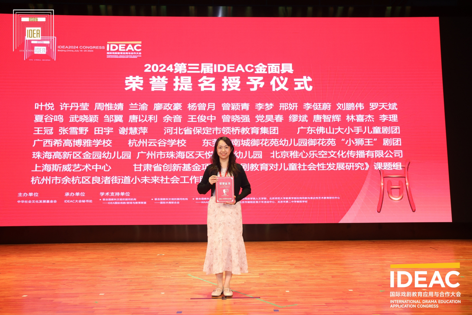 教育戏剧团队多年来在高飞雁副院长的带领下立足于广西民族地区基础教育实际,以铸牢中华民族共同体意识为主线,开发系列英语教育戏剧融合课程,通过专业选修课、校级公选课、专业课教学融合、国培、区培项目、城区教研活动、中小学校本教研活动等方式实践推广,在服务教育教学的同时不断讲好民族团结故事,传播优秀传统文化,团队获得2024IDEAC“金面具”戏剧教育成果双年展“金面具杰出戏剧教育管理者”荣誉,叶悦老师获“戏剧教育综合应用与实践金面具杰出教师”提名荣誉提名。在大会上,澳大利亚戏剧协会主席、澳大利亚墨尔本迪肯大学教育学院艺术教育(戏剧)教授乔·拉斐尔和IDEAC国际戏剧教育应用与合作大会副秘书长、中华社会文化发展基金会“美育与未来素养”公益基金副主任王丽英,共同为获得该奖项的 ai去衣