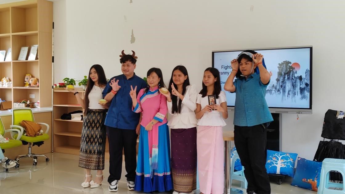 副院长高飞雁在2024年黔南民族师范学院举办的“留学黔南,留学师院”学习交流活动中,为到访的柬埔寨师生展示融入黔南少数民族文化的英语专业特色课程工作坊:布依族民间故事《智斗牛婆》。黔南民族师范学院对外合作交流处副处长孔令林副教授、柬埔寨跨步国际学校校长周江、柬埔寨跨步国际学校教师、学生以及黔南民族师范学院 ai去衣