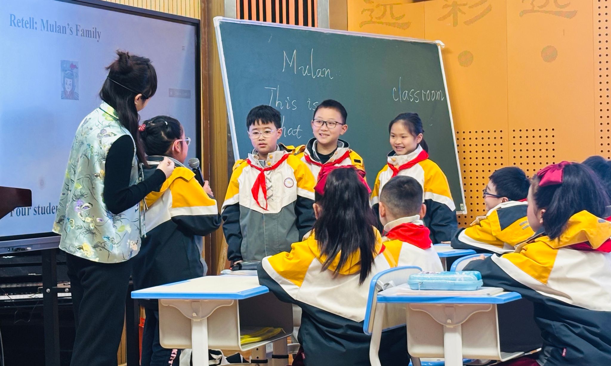 教师叶悦呈现了一节精彩的外研版三年级上册新教材《Mulan》教育戏剧示范课。叶老师通过“教师入戏”、“良心巷”、“音效模拟”、“声音魔法”、“角色扮演”等多种戏剧教学方法,引导学生感受木兰的孝顺、勇敢和家国情怀。学生通过“创编台词”活动,运用所学句型表达对木兰的敬佩之情,提升语言表达能力。课堂以“我想对木兰说的一句话”为结尾,让学生自发表达情感,将课堂氛围推向高潮。