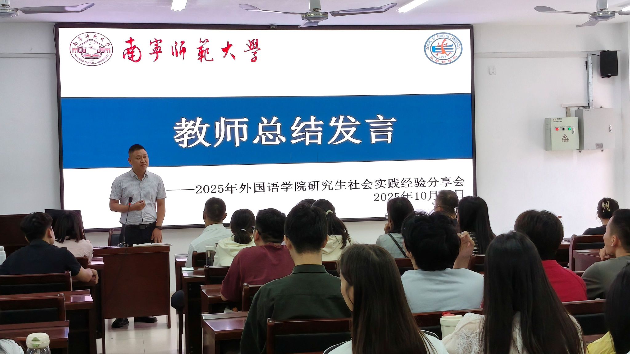 最后,蒙岚副院长、党委刘晖晖副书记、黄信教授、卢澄副教授作了总结发言。他们高度赞扬了参与此次分享的同学们的进步与成长,勉励2025级研究生以优秀前辈为榜样,勇于走出课堂舒适区,积极把握实践机遇,将外语专业能力与家国情怀、国际视野相融合,在社会实践中深化对现实社会的理解,不断锤炼综合素养,实现个人价值。