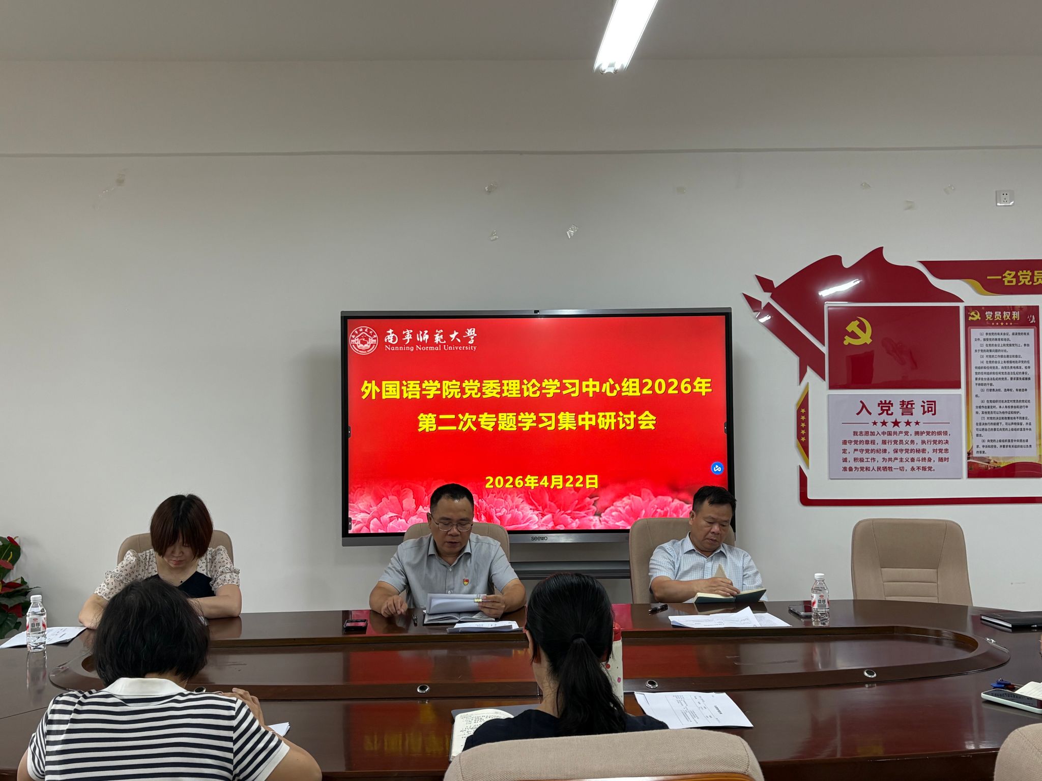 党委理论学习中心组在武鸣校区实验教学楼B614召开2026年第二次专题学习集中研讨会。会议由学院党委书记苏华主持,学院党委委员、纪委委员参加会议。