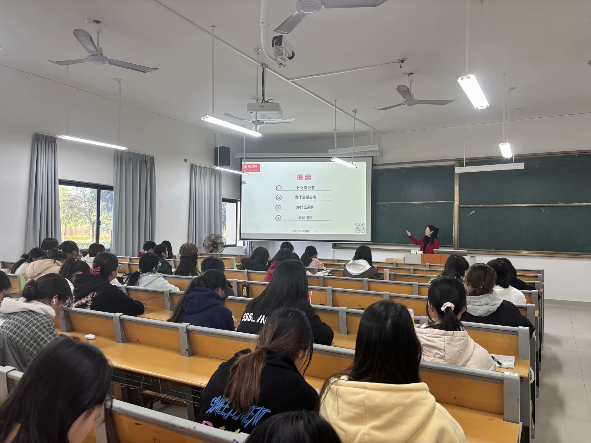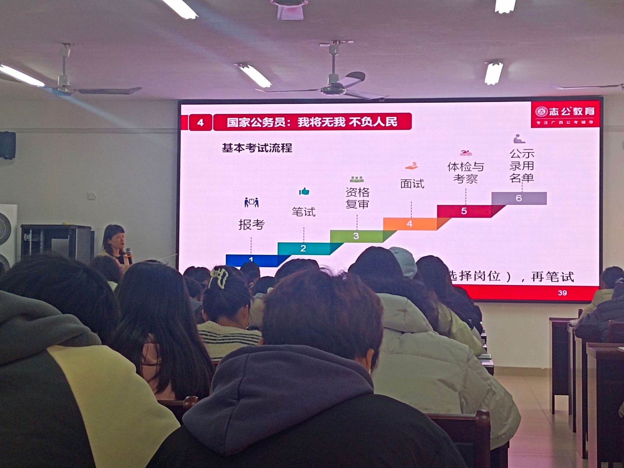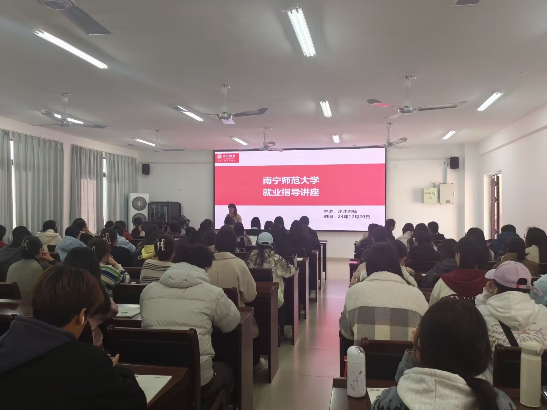 于2024年12月18日在实验楼2-A102教室举办了以志公教育蒋梦媛老师为主讲的2025年广西公职考试备考指导讲座,并于12月20日在实验楼1-B515教室举办了以志公教育陈沙沙老师为主讲的大学生就业指导讲座。