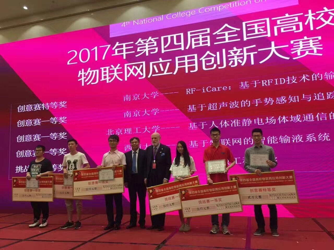 2017年5月12 – 14日,由教育部科技发展中心主办的第四届全国高校物联网应用创新大赛创意赛全国总决赛在东华大学图文信息大楼第一报告厅成功举办。我系分布式计算团队(成员:何兵兵,张柯岩,陆逸嘉;指导教师:谢磊)凭借“RF-iCare:基于RFID技术的输液监测系统”,从全国七大赛区1050只队伍中脱颖而出,获得第1名的优异成绩,夺得创意赛全国特等奖。我系团队(成员:孙珂、凌康;指导教师:戴海鹏)凭借“基于超声波的手势感知与追踪”的项目夺得总决赛第2名和一等奖(其中特等奖一名,一等奖三名,二等奖六名)。谢磊和戴海鹏作为团队指导教师分别获得最佳指导教师奖。在ACM图灵奖五十年中国大会的庆功晚宴暨赛事颁奖典礼上,图灵奖获得者、互联网之父Vinton Cerf和教育部科技发展中心李志民主任参与颁奖典礼,并颁发特等奖和最佳指导老师奖奖牌。出席者还包括图灵奖获得者John Hopcroft,ACM主席Vicki Hanson,ACM Fellow、IEEE Fellow、清华大学软件学院院长刘云浩等。此次总决赛的参赛队伍共有从七大赛区选拔出来的包括南京大学、清华大学、武汉大学、哈尔滨工业大学、华中科技大学、西安交通大学等在内的42所高校75支参赛队伍。