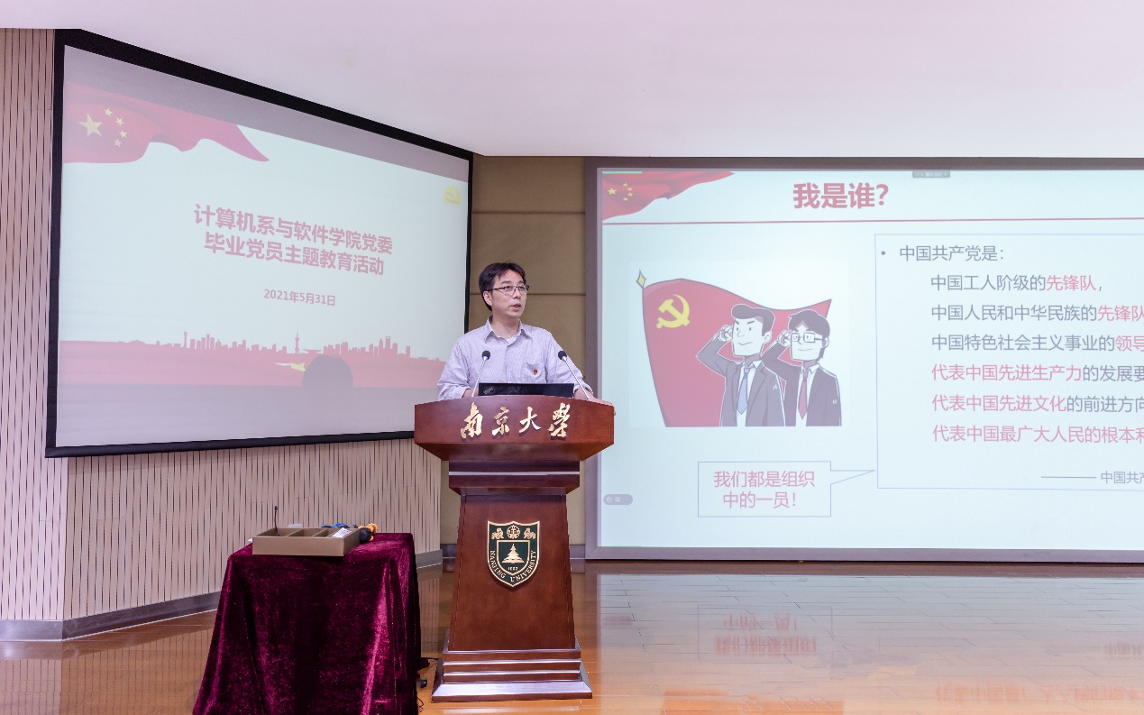 随后,武书记借用习近平总书记的话向计算机系所有毕业生党员提出三点期望:一、要有远大理想,砥砺奋斗。广大青年既是追梦者,也是圆梦人。追梦需要激情和理想,圆梦需要奋斗和奉献。广大青年应该在奋斗中释放青春激情;二、要勤奋学习,知行合一。梦想从学习开始,事业靠本领成就。广大青年要自觉加强学习,不断增强本领,既多读有字之书,也多读无字之书,注重学习人生经验和社会知识。同时要坚持知行合一,在实践中学真知、悟真谛;三、不忘初心,勇担大任。一代人有一代人的长征,一代人有一代人的担当。新时代中国青年应该积极拥抱新时代,奋进新时代,让青春在为祖国、为人民、为民族、为人类的奉献中焕发出更加绚丽的光彩。此外,武书记也希望在座的所有同学在今后的学习工作中,铭记“立大志,明大德,成大才,担大任”,努力践行“今日我以南大为荣,明日南大以我为荣”,发挥先锋模范作用,展现南大风采。