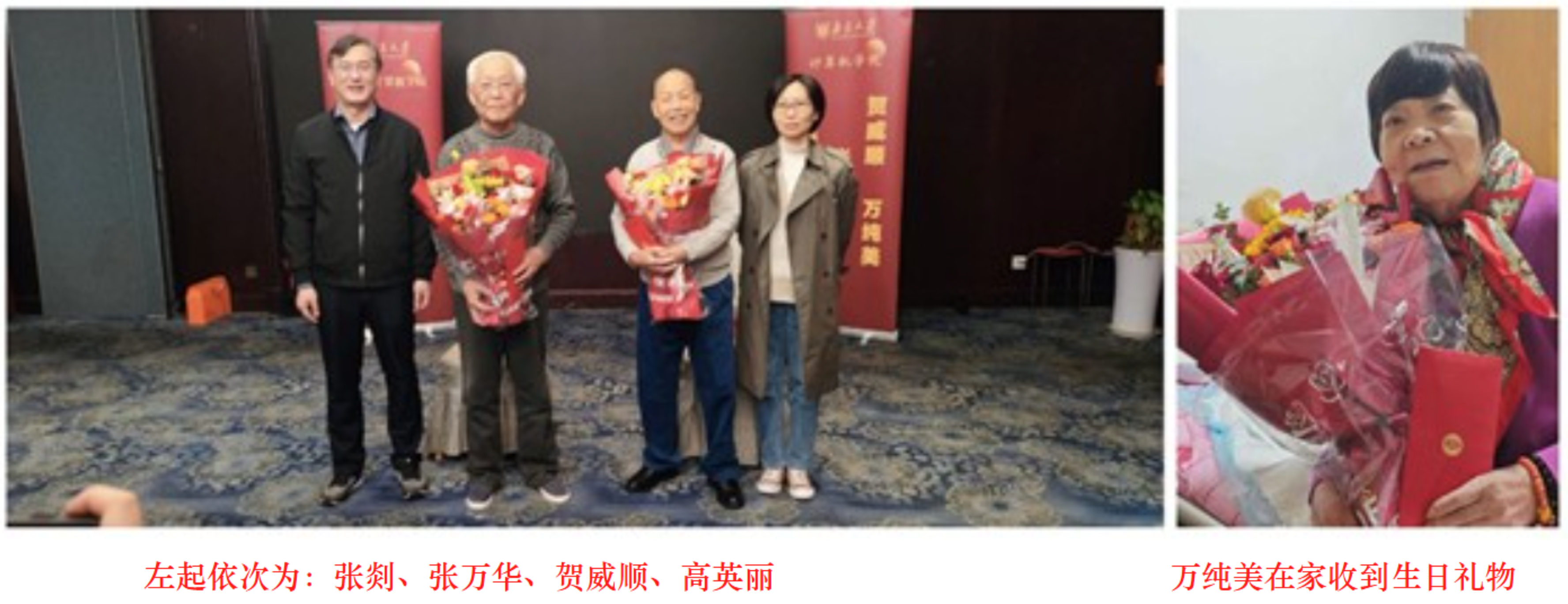 金秋十月精神爽,丹桂飘香人寿增。今年,计算机学院又有两位老教师迈入90 高寿的行列,他们是:贺威顺和万纯美;另外,张万华今年已达80高龄。借举办重阳节敬老恳谈会的机会同时为他们三位老同志举行了简洁而不失隆重的集体祝寿仪式。院党委书记在致辞中表达了对他们的祝贺和赞誉,赞扬这三位老同志在南大工作几十载,他们爱党爱国,热爱高等教育事业,在教学服务岗位上辛勤耕耘,默默奉献,工作兢兢业业,认认真真,在南大计算机学科的创建和发展过程中都作出了重要贡献。万纯美老师因身体抱恙,未能亲临会场,同样对她表示祝福,祝愿她早日康复。学院副院长张剡为三位寿星呈送祝院领导的祝寿词和祝寿金红包,院党委秘书高英丽老师为他们献上鲜花,呈上幸福的果篮。并恭祝老寿星们生日快乐,祝你们福如东海长流水,寿比南山不老松!到场的二位寿星代表都发表了即兴感言,简要回顾了在南大学习工作和成长的经历,一致表达了对院领导和出席老同志的谢意。