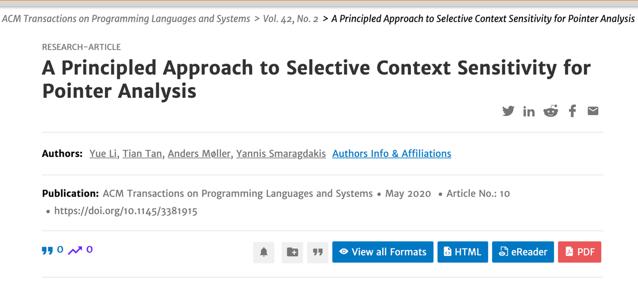 该成果在2020年5月20日,以“A Principled Approach to Selective Context Sensitivity for Pointer Analysis”为题发表于《ACM Transactions on Programming Languages and Systems》期刊上(TOPLAS 42(2)),南京大学为第一及通讯单位,李樾为第一作者,谭添为通讯作者,丹麦奥胡斯大学Anders Møller教授、希腊雅典大学Yannis Smaragdakis教授为合作者。TOPLAS是程序设计语言领域的顶级国际期刊,也是CCF推荐A类期刊。该论文是TOPLAS自1979年创刊41年来,南京大学首次、我国内地高校和科研机构第三次(近五年唯一)以第一单位名义发表的科研成果。