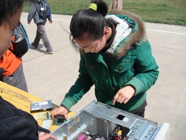 现场的气氛非常热烈,很多同学都跃跃欲试。大家平时只见识到计算机用户界面的多彩,软件功能的强大,对计算机的硬件组成却知之甚少。现在有机会探索一下计算机的硬件,何乐而不为呢?