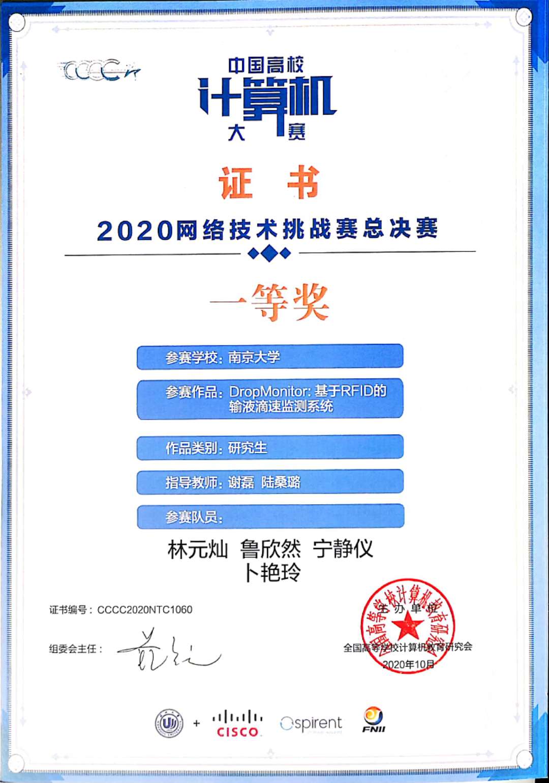 2020年10月25日,第五届中国高校计算机大赛-网络技术挑战赛在温州浙南科技城圆满落幕。在激烈角逐中,我系分布式计算团队(成员:林元灿、鲁欣然、卜艳玲、宁静仪;指导教师:谢磊、陆桑璐)的参赛作品“DropMonitor:基于RFID的输液滴速监测系统”脱颖而出,荣获全国一等奖。