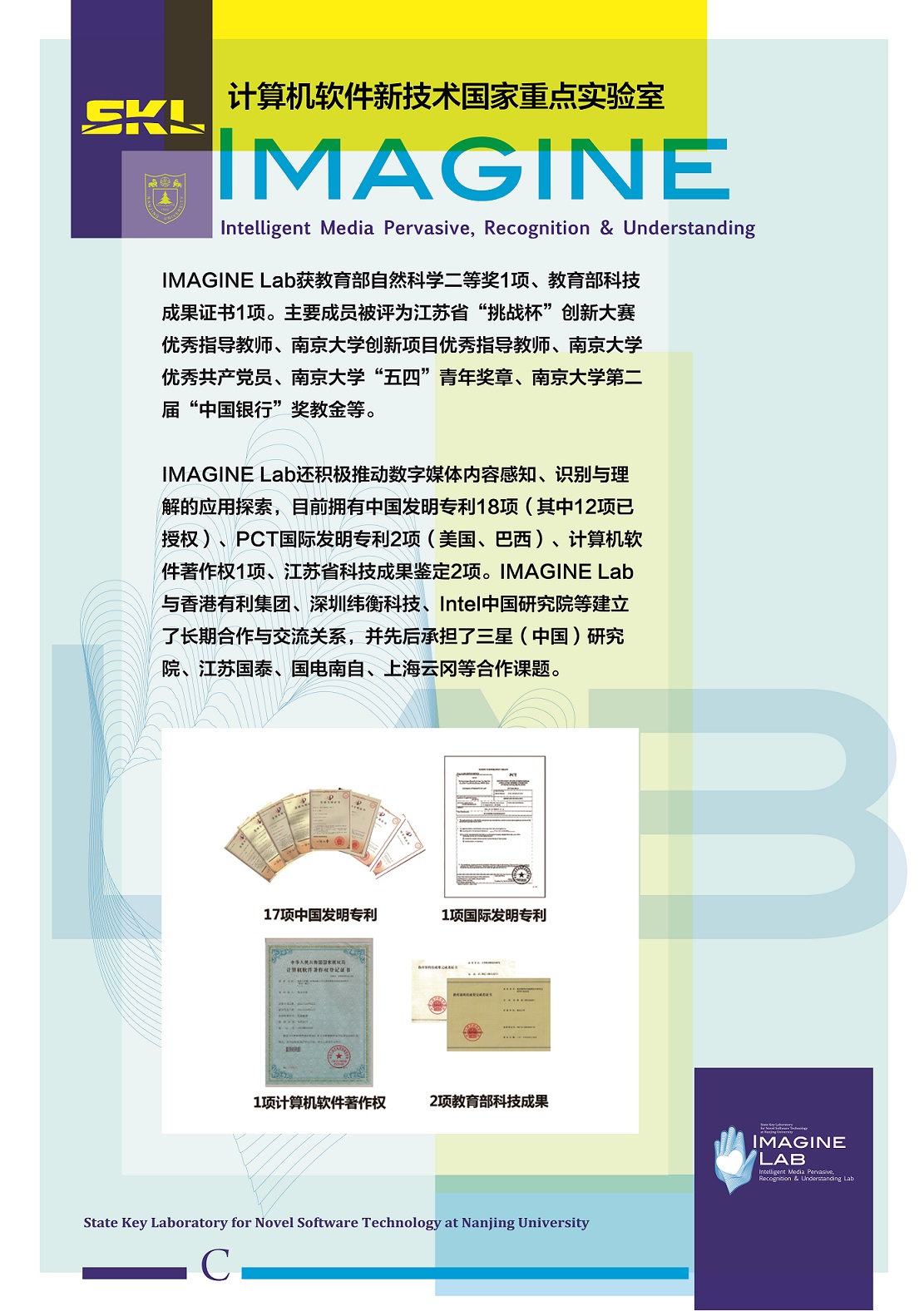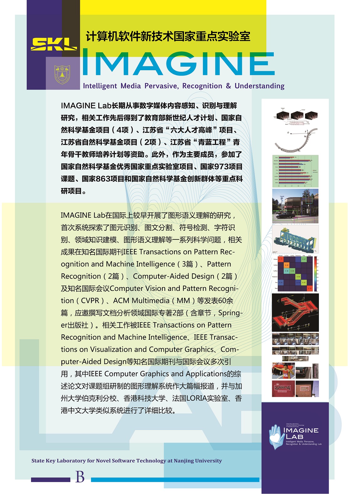 IMAGINE (Intelligent Media pervAsive, recoGnItion & uNdErstanding) is a lab established at at Nanjing University, China. The targets of IMAGINE lab include both algorithm/theory exploration and real-life systems developing. We believe automatic understanding and visualizing the content of everyday real (big) media data stream is one of the fundamental challenges in computer science, and significant advances will be made over the next few years by combining the state of the art knowledge representations and machine learning or statistical modeling techniques on big multimeida data from Internet.
