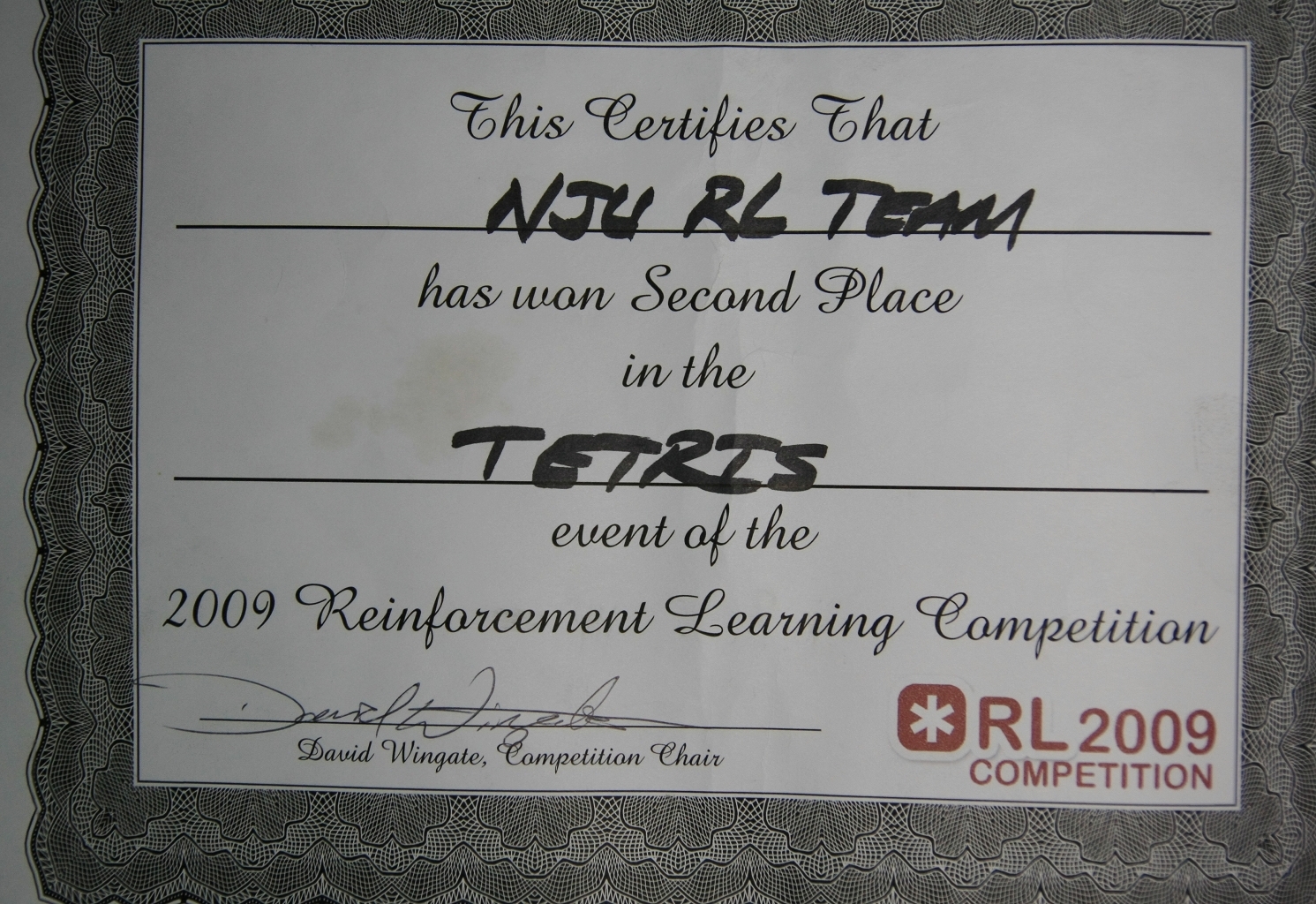Zhenzhiwei Scholarship, Nanjing University, 2009. - Second place on Tetris event, , 2009. (NJU RL Team)