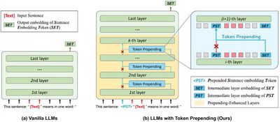 从大语言模型中抽取句子嵌入由于其无需数据和微调受到了广泛的注意。之前的方法通常基于提示来引出大语言模型编码句子嵌入的能力。然而,此类方法受限于大语言模型的单向注意力机制且没有有效捕捉句子的核心语义。为此,(1) 研究小组提出了基于词元前置的方法来克服大语言模型单向注意力的不足。(2) 研究小组提出了对比提示的方法通过引入辅助提示和推断时引导使其编码句子的核心语义。