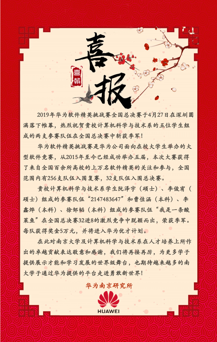 2019年华为软件精英挑战赛全国总决赛于4月27日在深圳落下帷幕。南京大学计算机科学与系的5位同学组成的两支参赛队伍在全国总决赛中斩获季军!华为技术有限公司向我系发来喜报,对我系在人才培养上所作出的卓越贡献表达敬意和感谢。