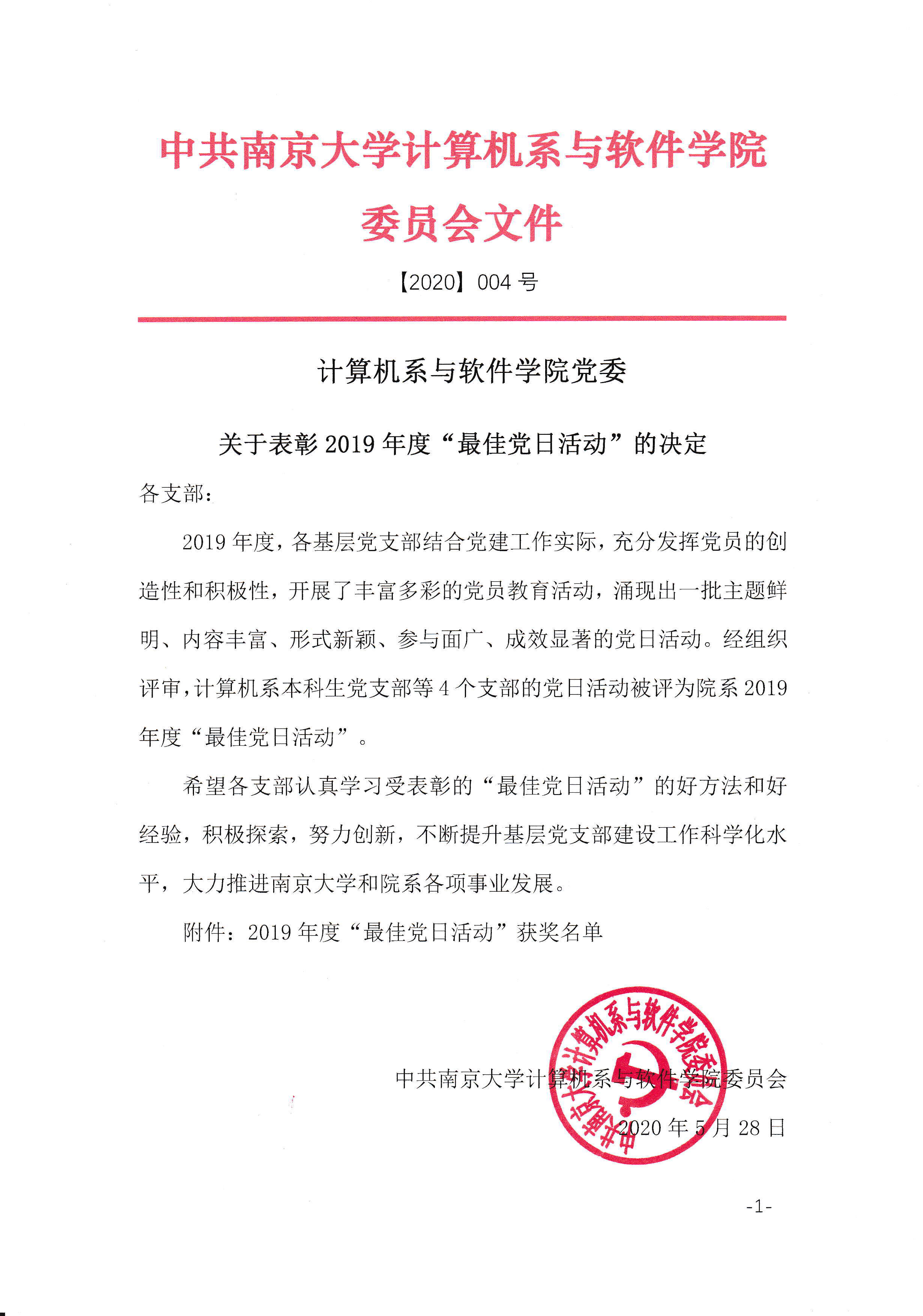 关于表彰2019年度‘最佳党日’的决定