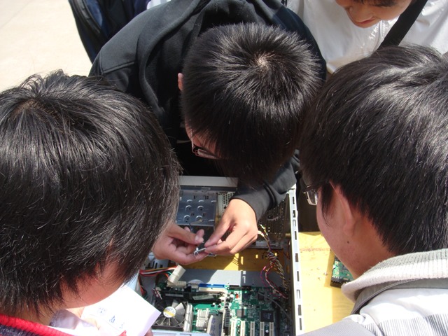 现场的气氛非常热烈,很多同学都跃跃欲试。大家平时只见识到计算机用户界面的多彩,软件功能的强大,对计算机的硬件组成却知之甚少。现在有机会探索一下计算机的硬件,何乐而不为呢?