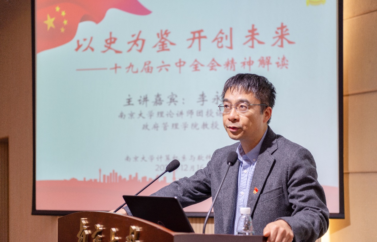 2021年12月16日下午,计算机系邀请南京大学理论讲师团授课专家、政府管理学院李永刚教授作《以史为鉴,开创未来——十九届六中全会精神解读》专题党课。计算机系与软件学院党委书记武港山出席并主持讲座,计算机系和人工智能学院全体教职工及学生党员参加。
