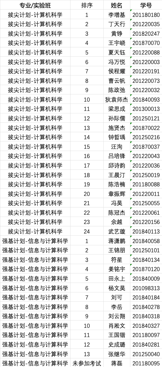 根据南京大学2020级本科生二次选拔方案,进入拔尖计划(计算机)/强基计划(信息与计算科学)复试考核的学生最终成绩排序公布如下,其中,拔尖计划(计算机)排序前20名、强基计划(信息与计算科学)排序前13的学生拟进入预录取名单。请进入拟录取名单的同学于9月15日17点前至计算机系楼附楼541马骏老师处签订确认书。最终预录取名单以学校公布为准。