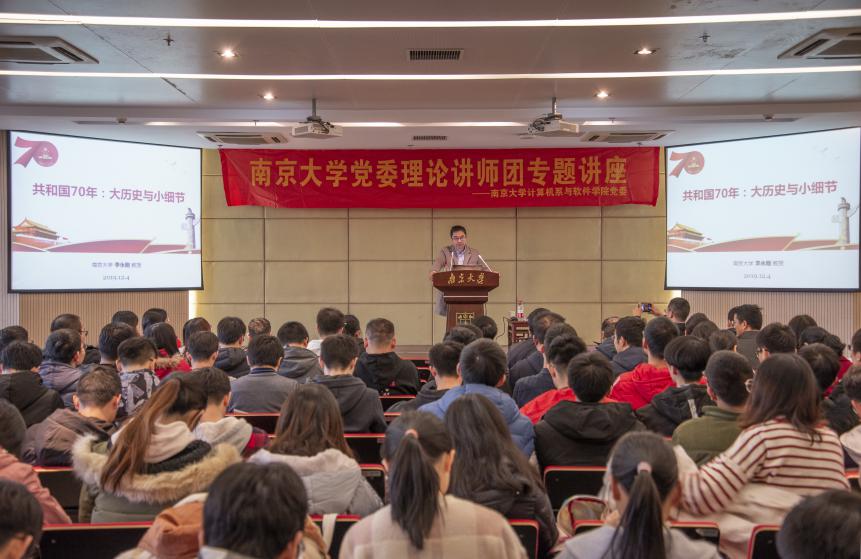 为进一步深入开展“不忘初心、牢记使命”主题教育活动,教育引导党员同志明确使命担当,2019年12月4日,计算机系与软件学院党委特邀南京大学党委理论讲师团授课专家、南京大学政府管理学院李永刚教授,以“共和国70年:大历史与小细节”为主题,为计算机系全体师生党员讲授专题党课。本次活动由系党委副书记宫玲琳老师主持,计算机系全体师生党员到场参加。