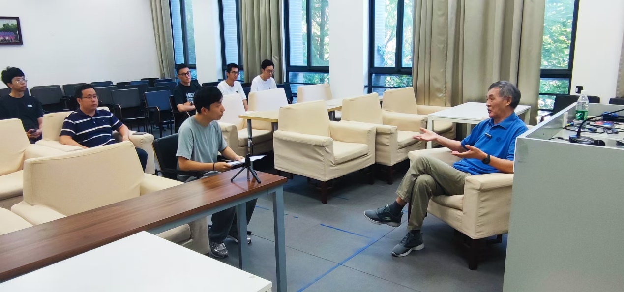 八月中旬,立秋虽过,暑气未消,天地间仍蒸腾着盛夏的余威。上午九时半,陈道蓄教授冒着酷署从住居的龙江小区专程乘坐一小时的地铁赶到仙林校区计算机楼219会议室接受釆访。访谈由学院2021级本科生刘博石主持,2023级本科生林雨昕协助拍摄,学院关工委副主任潘金贵教授以及在职青年教师过洁副教授和六名暑假在实验室加班的研究生全程参加了眝听学习。